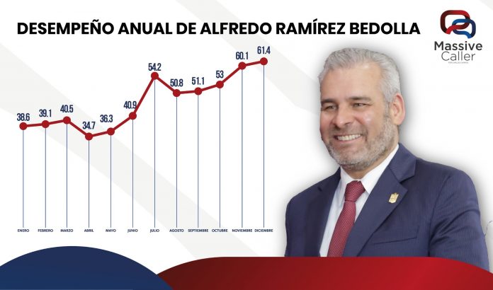 MORELIA, MICH.- El gobernador de Michoacán, Alfredo Ramírez Bedolla, creció 22.8 puntos en aprobación durante 2023, de acuerdo con la casa encuestadora Massive Caller, la cual en su reporte del mes de diciembre, registra 61.4 puntos porcentuales.