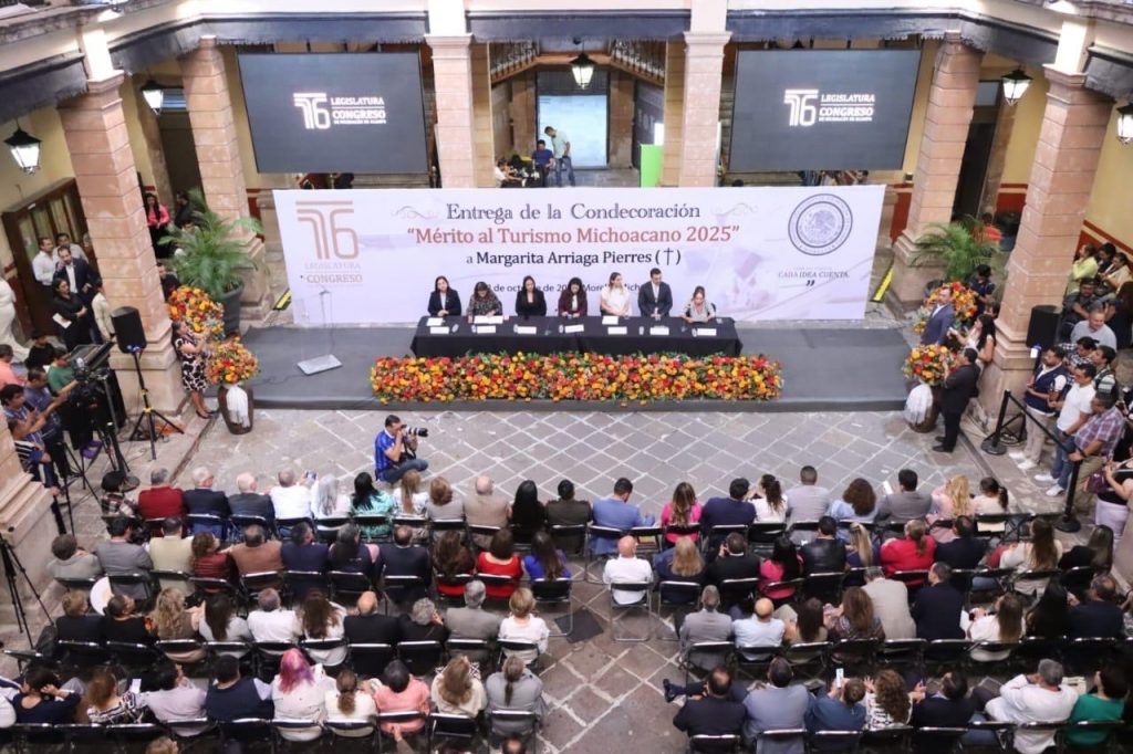 MORELIA, MICH.- El Congreso del Estado a través de la Comisión de Turismo, entregó la Condecoración “Mérito al Turismo Michoacano 2025” a Margarita Arriaga Pierres quien, con su esfuerzo, dedicación y compromiso, contribuyó de manera significativa al desarrollo, atención y promoción de la actividad turística en el estado.