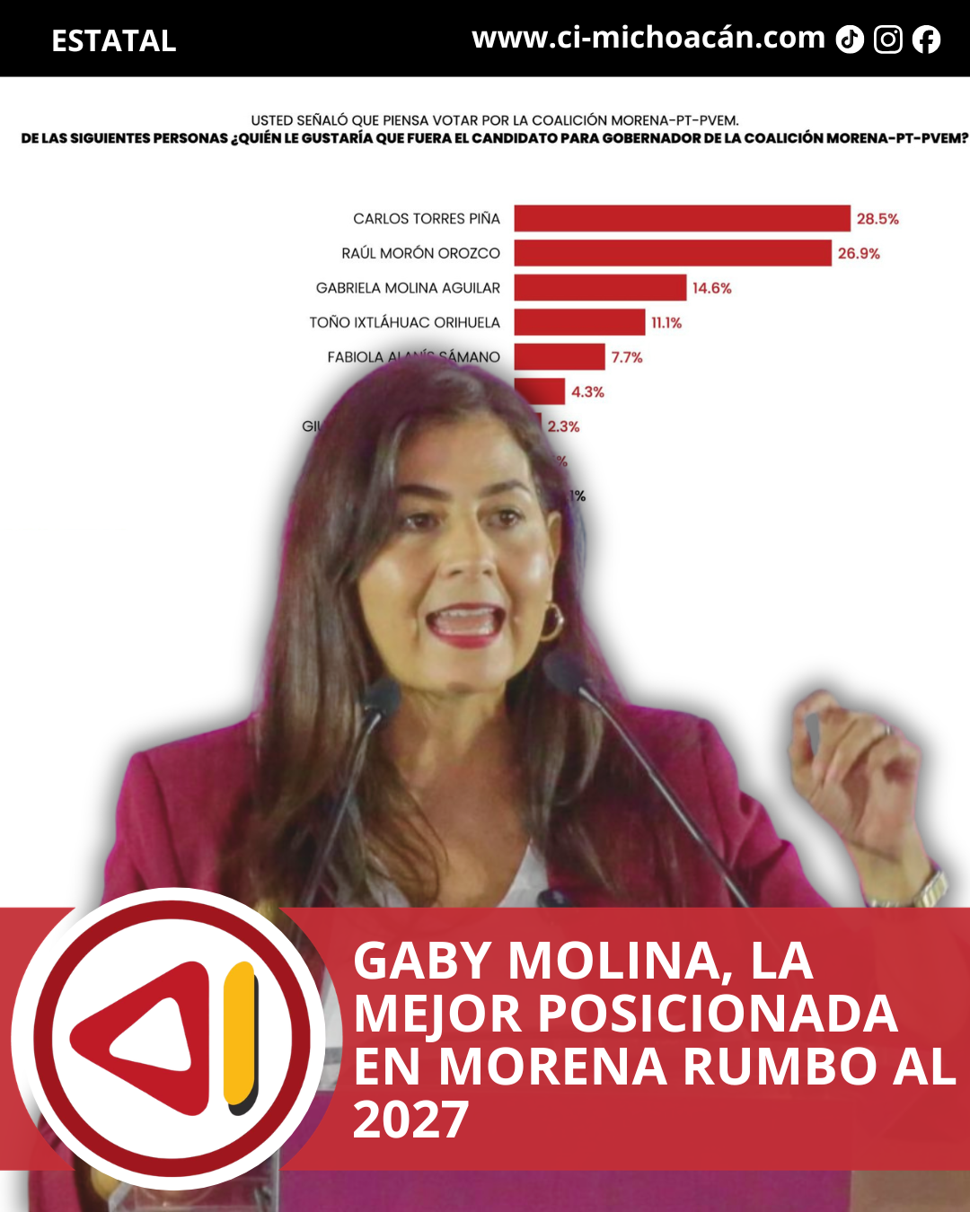 Morena-PT-PVEM lidera como fuerza política y Gaby Molina se consolida como la mujer mejor posicionada y con mayor proyección rumbo a la definición interna de 2027.