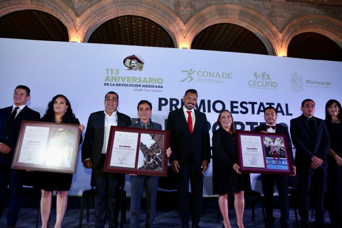 MORELIA, MICH.- En emotiva ceremonia en Palacio de Gobierno, Grisel Tello Pimentel, presidenta del Patronato del Sistema DIF, entregó el Premio Estatal del Deporte 2023 al surfista Alfonso Aguilar Contreras, quien fue el deportista michoacano más destacado este año tras ganar bronce en los Centroamericanos y del Caribe San Salvador.