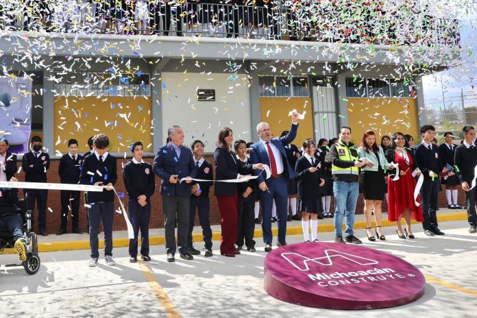 MORELIA, MICH.- El gobernador Alfredo Ramírez Bedolla inauguró las nuevas instalaciones de la Escuela Secundaria Técnica 166, obra en la que se invirtieron 12 millones de pesos para la construcción de un edificio con seis aulas, laboratorio, patio cívico, cancha de usos múltiples, entre otras amenidades.