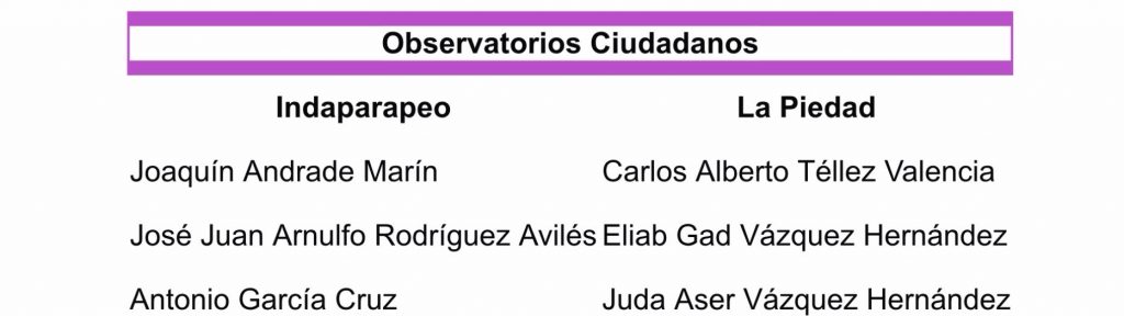MORELIA, MICH.- Con el objetivo de fortalecer la participación ciudadana y fomentar la vigilancia democrática en el ámbito municipal, el Instituto Electoral de Michoacán (IEM)llevó a cabo la instalación de los Observatorios Ciudadanos de los Ayuntamientos de La Piedad e Indaparapeo.