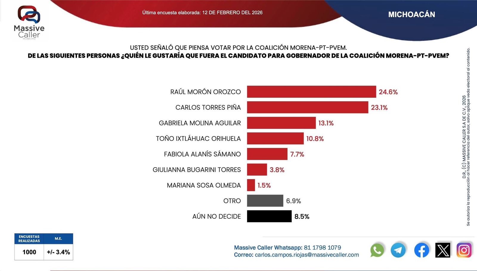MORELIA, MICH.- La más reciente medición de la casa encuestadora Massive Caller, levantada el 12 de febrero de 2026 con mil entrevistas y un margen de error de ±3.4%, muestra que la coalición Morena–PT–PVEM se mantiene a la cabeza en la intención de voto rumbo a la elección de gubernatura de Michoacán en 2027, al tiempo que se consolida el crecimiento de Carlos Torres Piña en la preferencia para encabezar la candidatura.