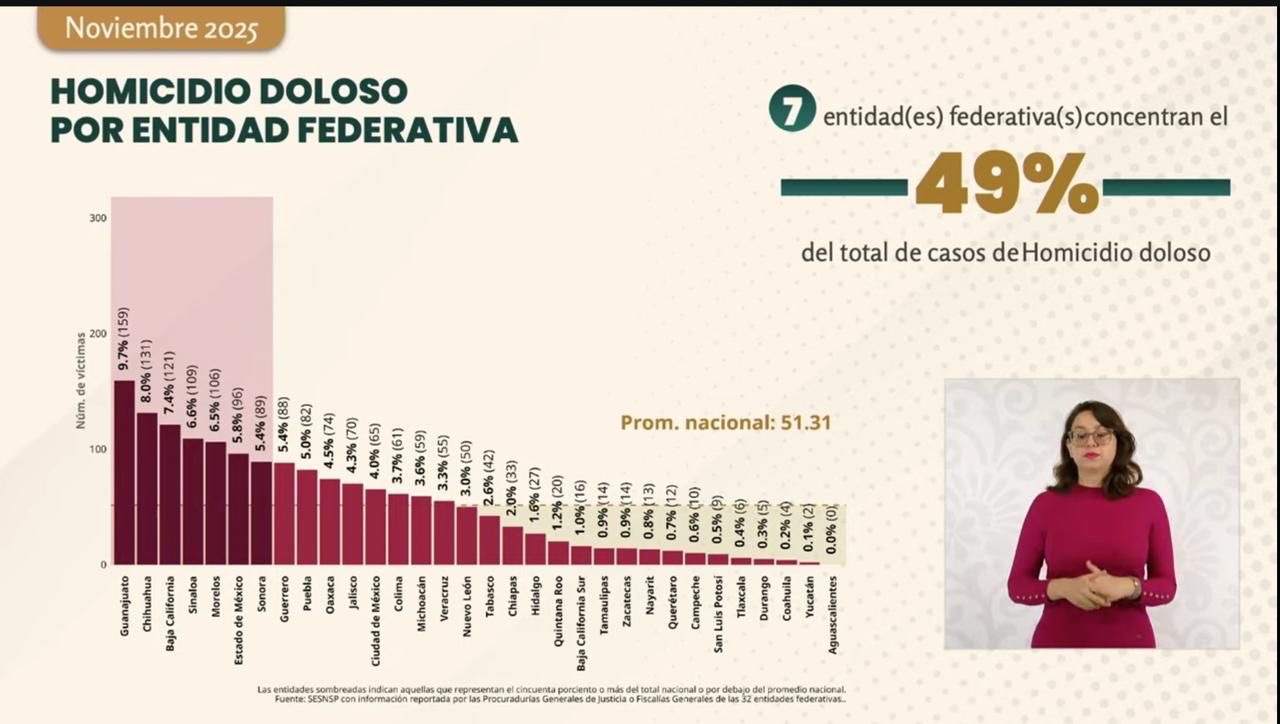 Figueroa Franco dio a conocer que son siete las entidades que concentraron el 49 por ciento del total de los homicidios dolosos ocurridos en el país durante noviembre de 2025.