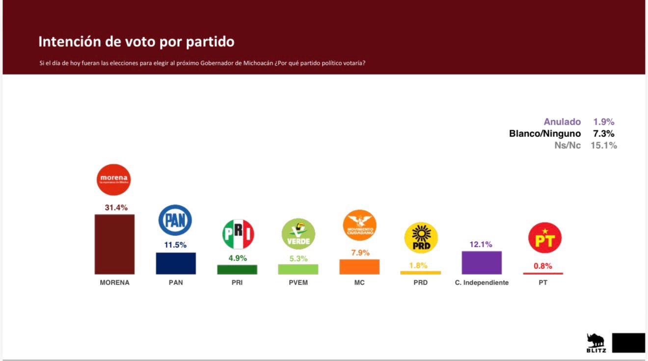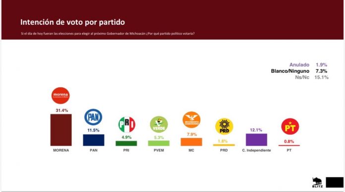 MORELIA, MICH.- Morena se mantiene como la principal fuerza política en Michoacán rumbo a la elección de gobernador, de acuerdo con la encuesta estatal de Blitz levantada del 7 al 17 de diciembre de 2025. En intención de voto por partido, Morena obtiene 31.4%, superando ampliamente al PAN con 11.5%, seguido por MC (7.9%), PVEM (5.3%) y PRI (4.9%), lo que confirma una ventaja superior a 19 puntos porcentuales sobre su competidor más cercano
