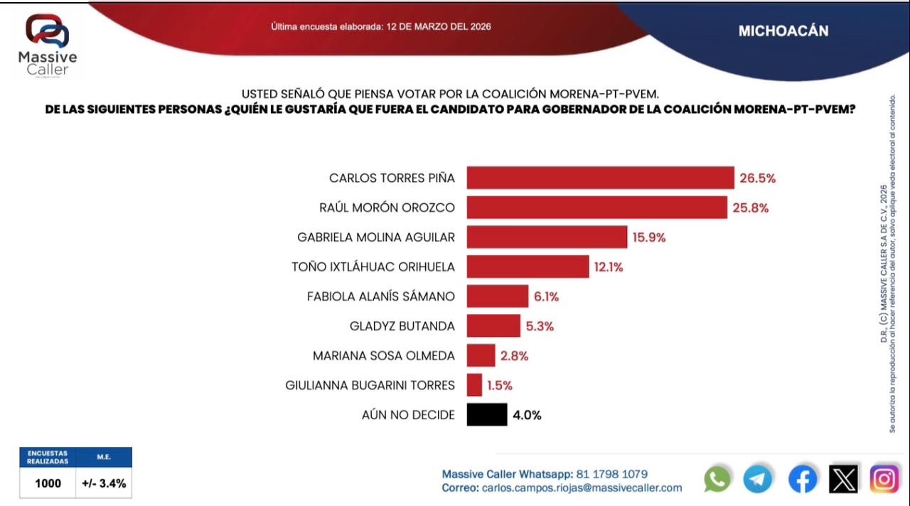 El estudio señala que, dentro de la coalición Morena-PT-PVEM, Torres Piña alcanza 26.5 % de respaldo como posible candidato, superando a Morón, quien registra 25.8 %, lo que evidencia un empate técnico pero con ligera ventaja para el primero.